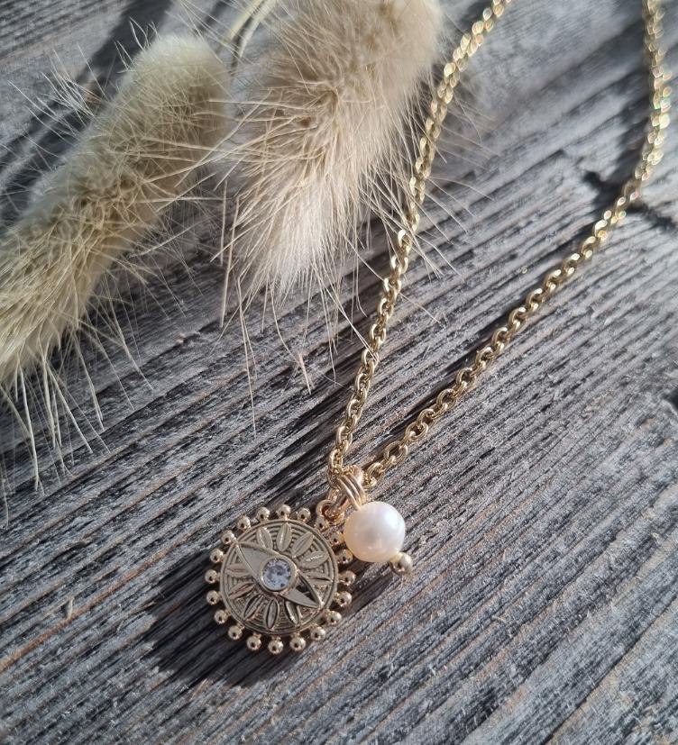 Lucie Halskette aus echtem Edelstahl. Anhänger Süsswasserpere u mit Kupferelement mit Herz